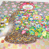 In this piece, Murakami’s iconic “Flower” motif bursts across the canvas in a vibrant spectrum, each bloom adorned with a soft, serene expression.