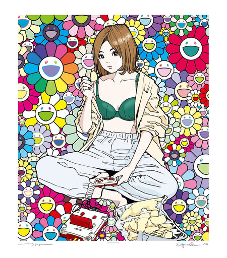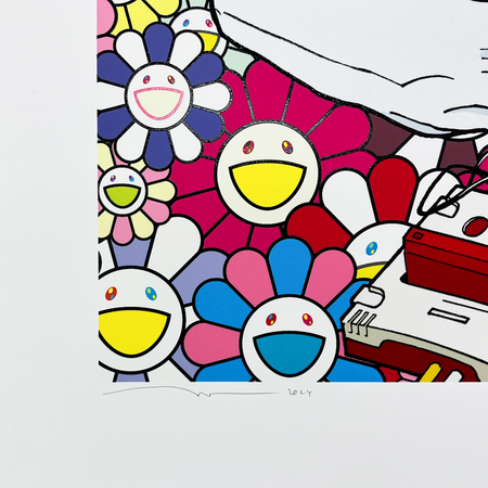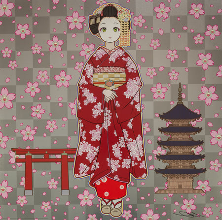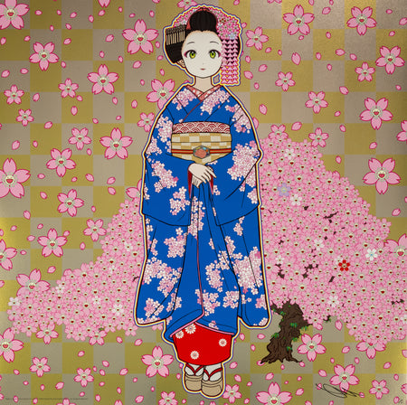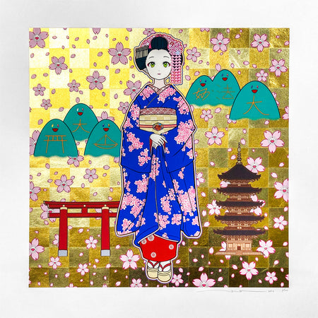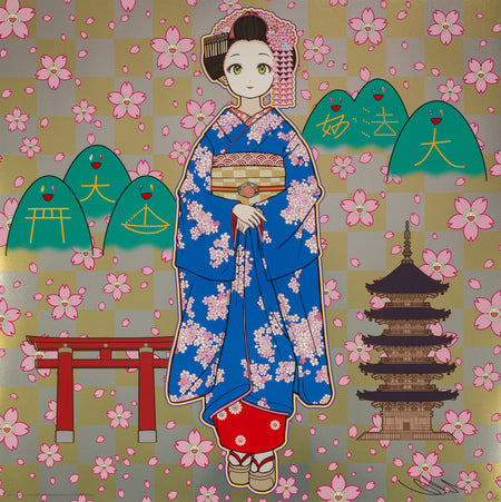 Takashi Murakami's Maiko in Kyoto Editions pay homage to the elegance and tradition of Kyoto's maiko culture, reinterpreted through his vibrant "Superflat" aesthetic. These works blend classical Japanese imagery with Murakami's contemporary pop-art style, featuring detailed depictions of maiko adorned in traditional kimono against colorful, abstract backdrops. The editions celebrate the beauty of cultural heritage while infusing it with modern dynamism, creating a captivating dialogue between the past and present.